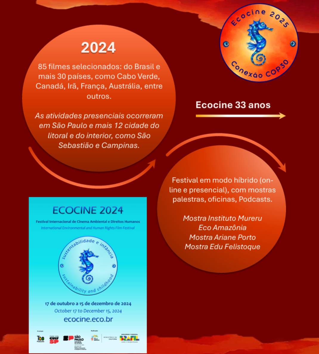 Dando continuidade à sua missão de construir pontes entre povos através do audiovisual, o ECOCINE- FESTIVAL INTERNACIONAL DE CINEMA AMBIENTAL E DIREITOS HUMANOS realizará sua 33ª Edição junto à COP30, em formato híbrido.