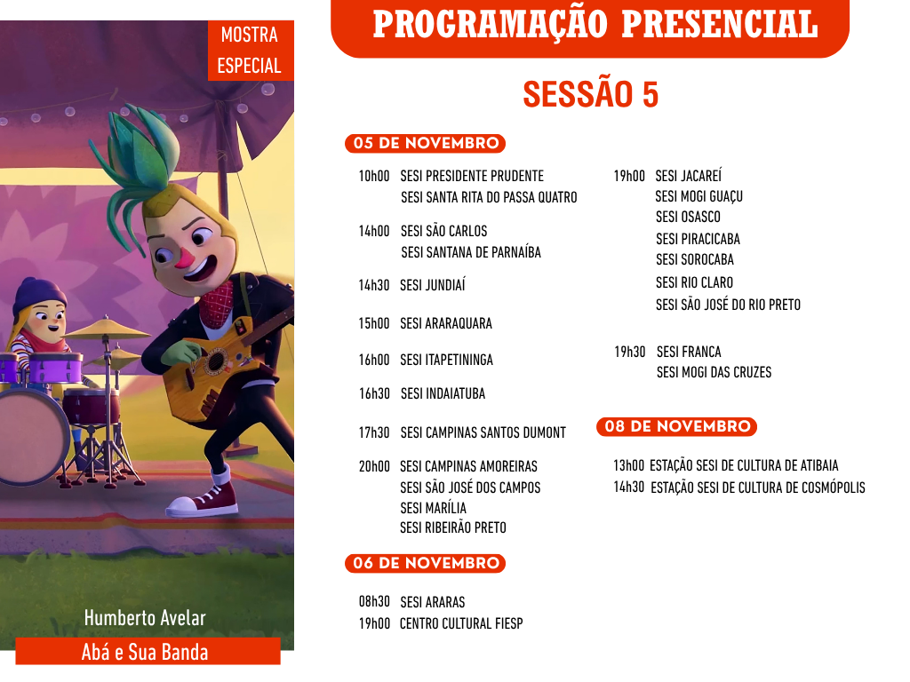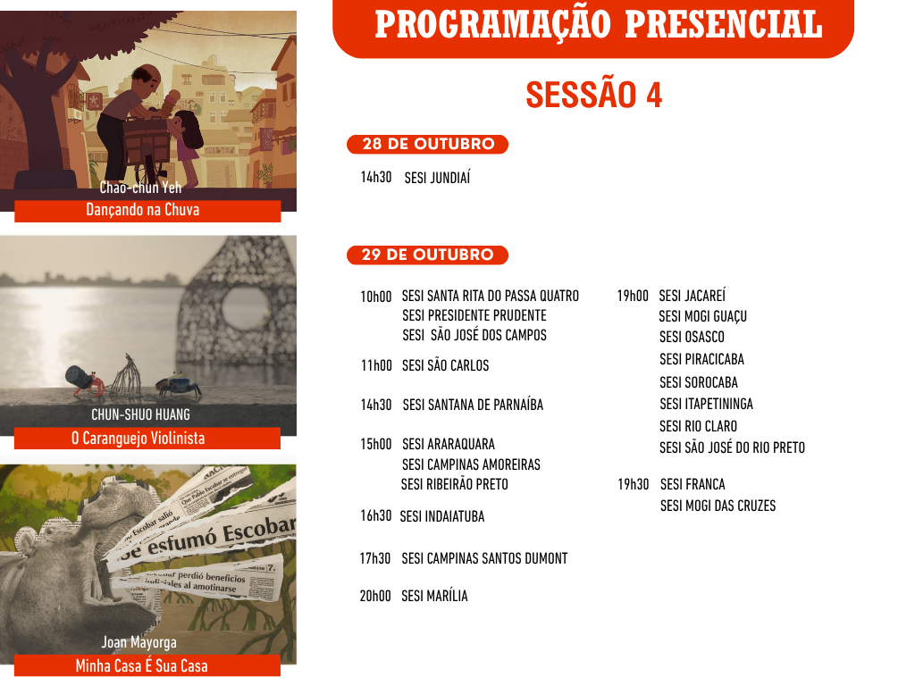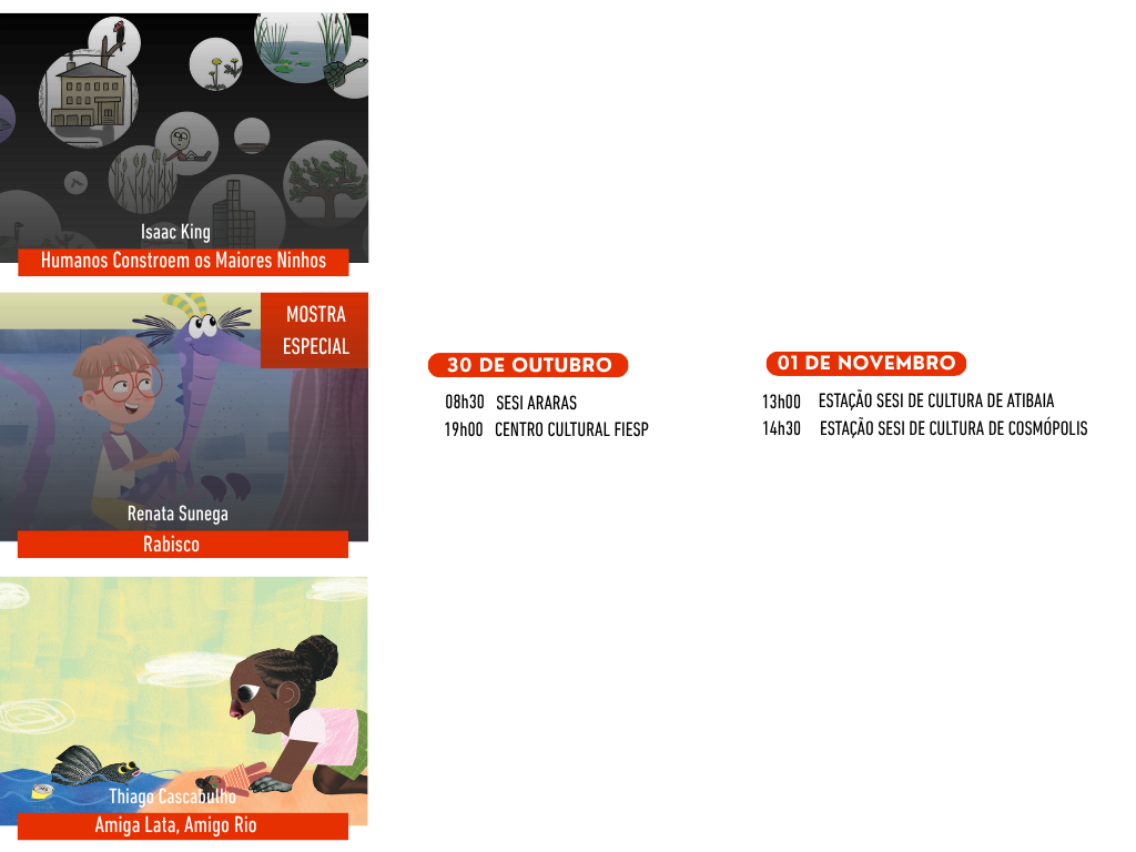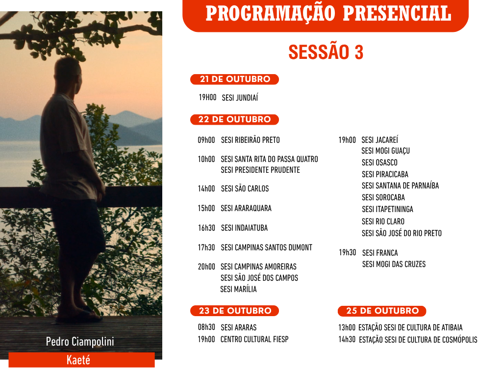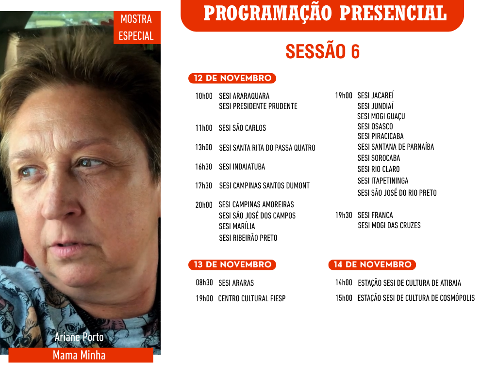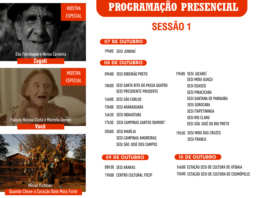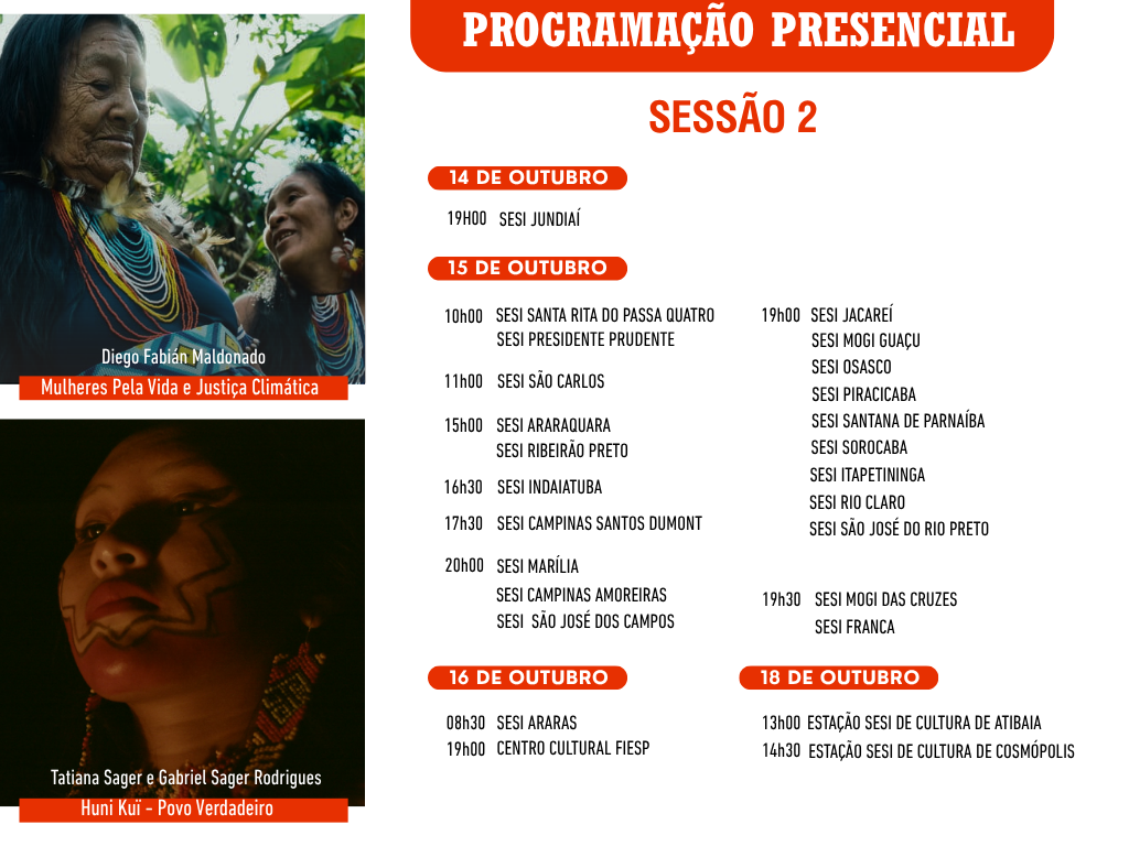 Pelo segundo ano consecutivo, a parceria com o SESI-SP leva a mostra presencial para 26 cidades do estado, ampliando o acesso ao cinema e fortalecendo o diálogo sobre temas ambientais e sociais. Ao todo, 15 filmes serão exibidos em unidades do SESI durante os meses de outubro e novembro. Os ingressos gratuitos poderão ser retirados pelo portal “Meu Sesi”.